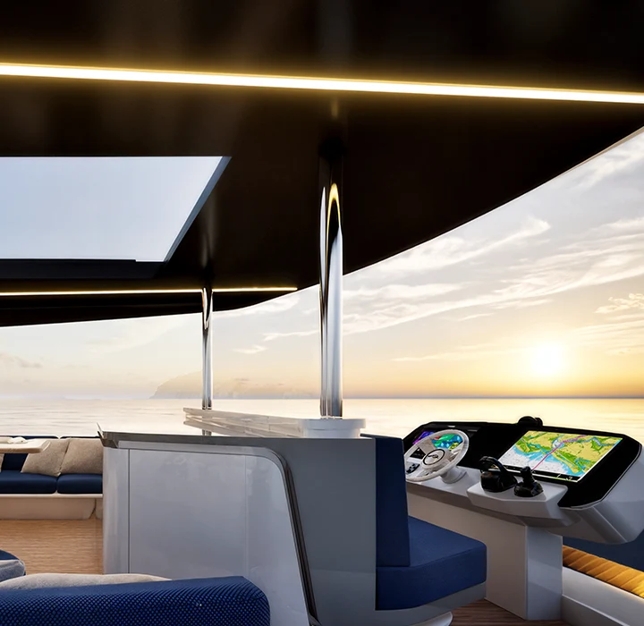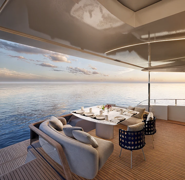 Sua imponência impressiona, enquanto o inédito balcony lateral de 8 metros transforma o mar em parte do convívio. O salão se abre à praça de popa em perfeita fluidez, criando uma experiência sensorial única, onde o horizonte é sempre o protagonista.