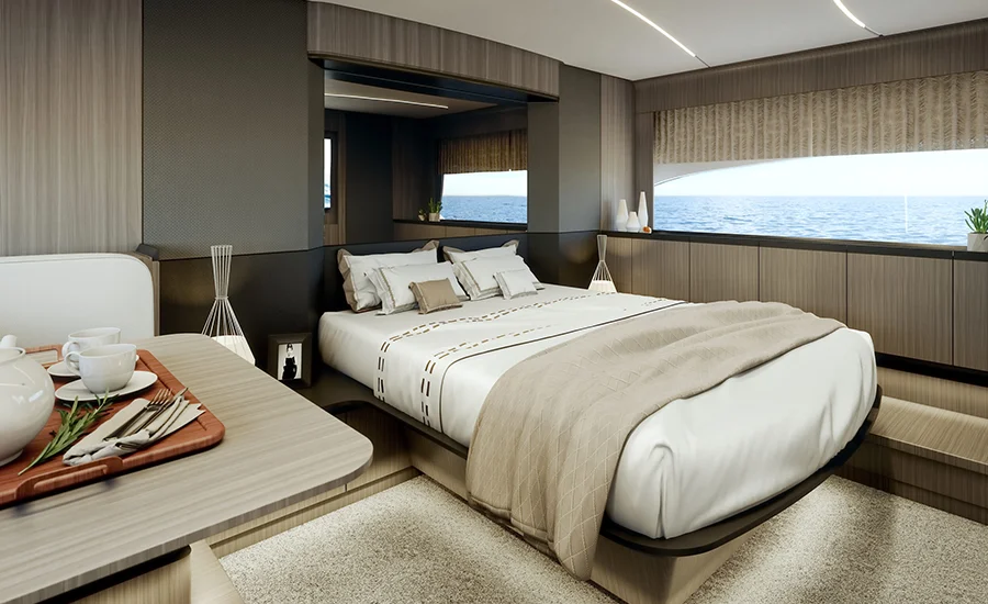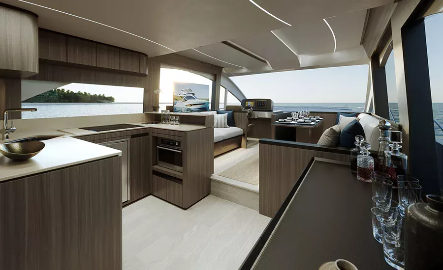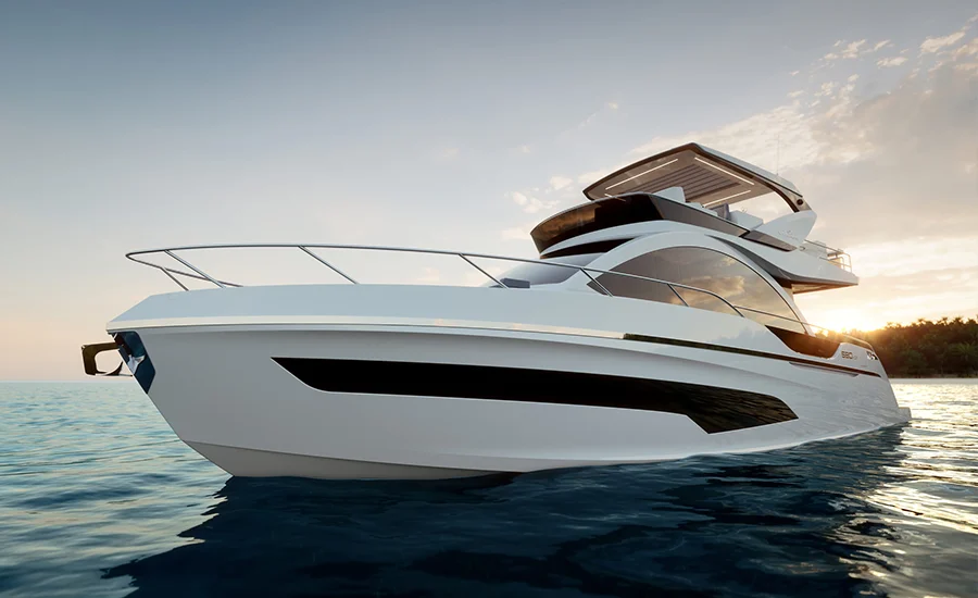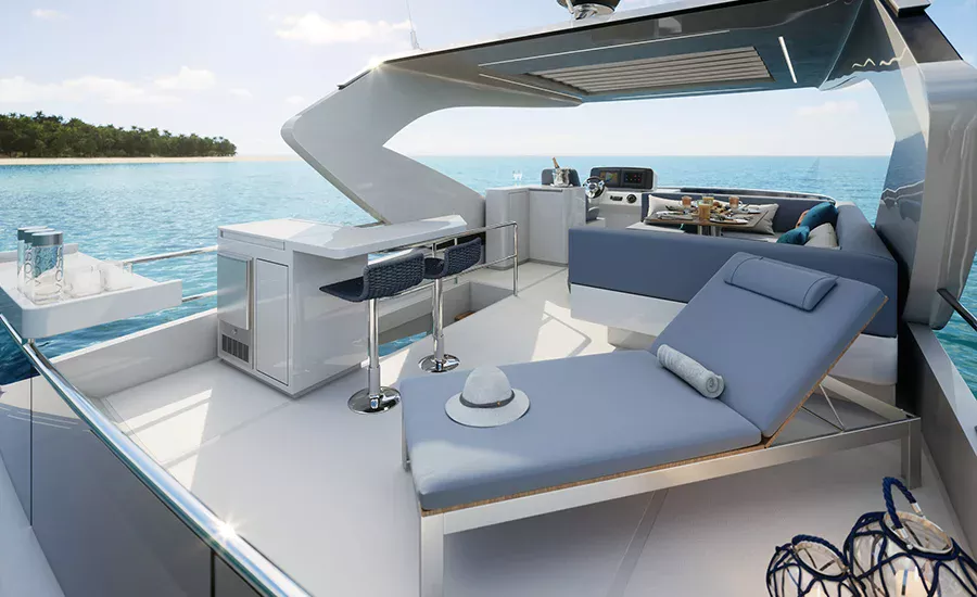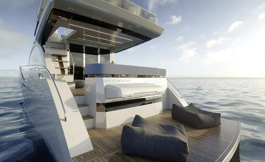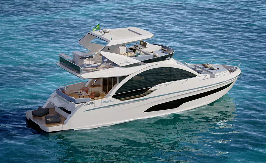 A 580 HDF é um barco sem paralelo no mercado. Seu volume é maior do que uma 60 pés e seu Fly e Hardtop, ambos em fibra de carbono, os maiores da categoria. Suas descomunais áreas envidraçadas proporcionam inédita visão 360, uma conquista Intermarine. Possui plataforma de popa submergível, Fly com guarda corpo de vidro, vista livre e continua da praça de popa à proa, móveis suspensos e suíte máster a meia nau aproveitando a boca máxima. Sofás do Fly em módulos, lounge na proa com sofá frente à frente e inédita circulação no bico da proa, devido ao guincho embutido da âncora. É um barco surpreendente.